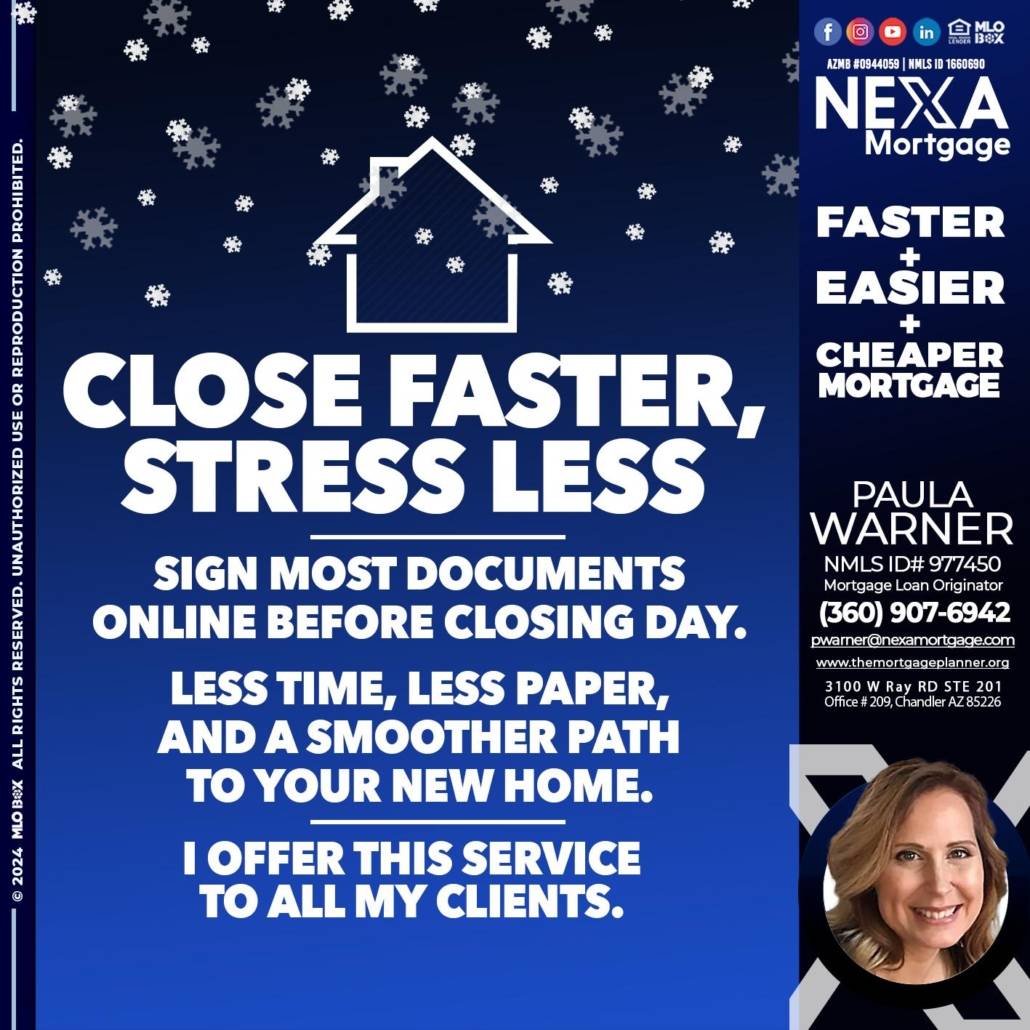 Hi, my name is Paula Warner. I’m a Loan Officer with NEXA Mortgage LLC., offering personalized mortgage solutions, fast customized quotes, great rates and service with integrity.