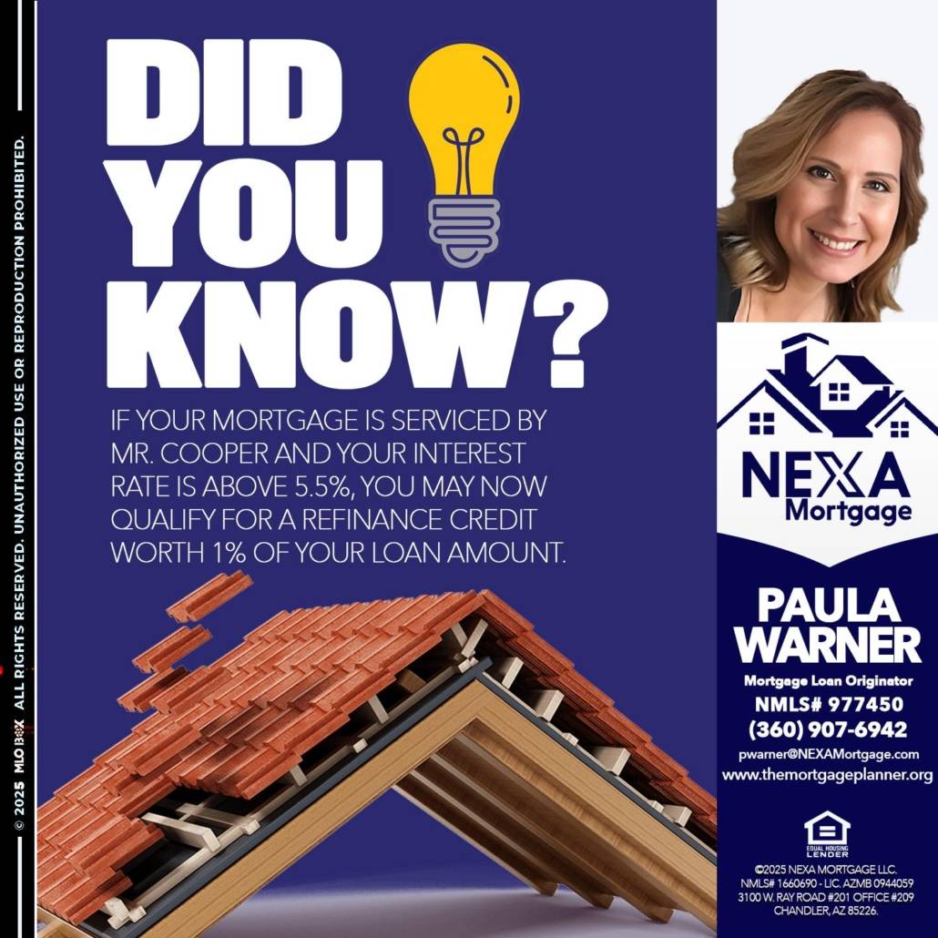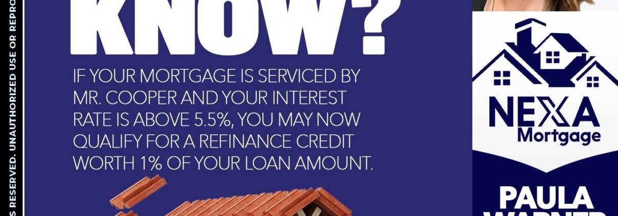 Hi, my name is Paula Warner. I’m a Loan Officer with NEXA Mortgage LLC., offering personalized mortgage solutions, fast customized quotes, great rates and service with integrity.