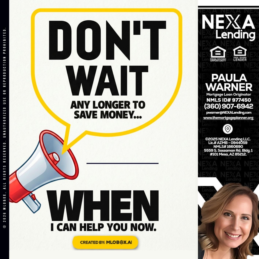 DONT WAIT - Paula Warner -Mortgage Loan OriginatorHi, my name is Paula Warner. I’m a Loan Officer with NEXA Lending LLC., offering personalized mortgage solutions, fast customized quotes, great rates and service with integrity.