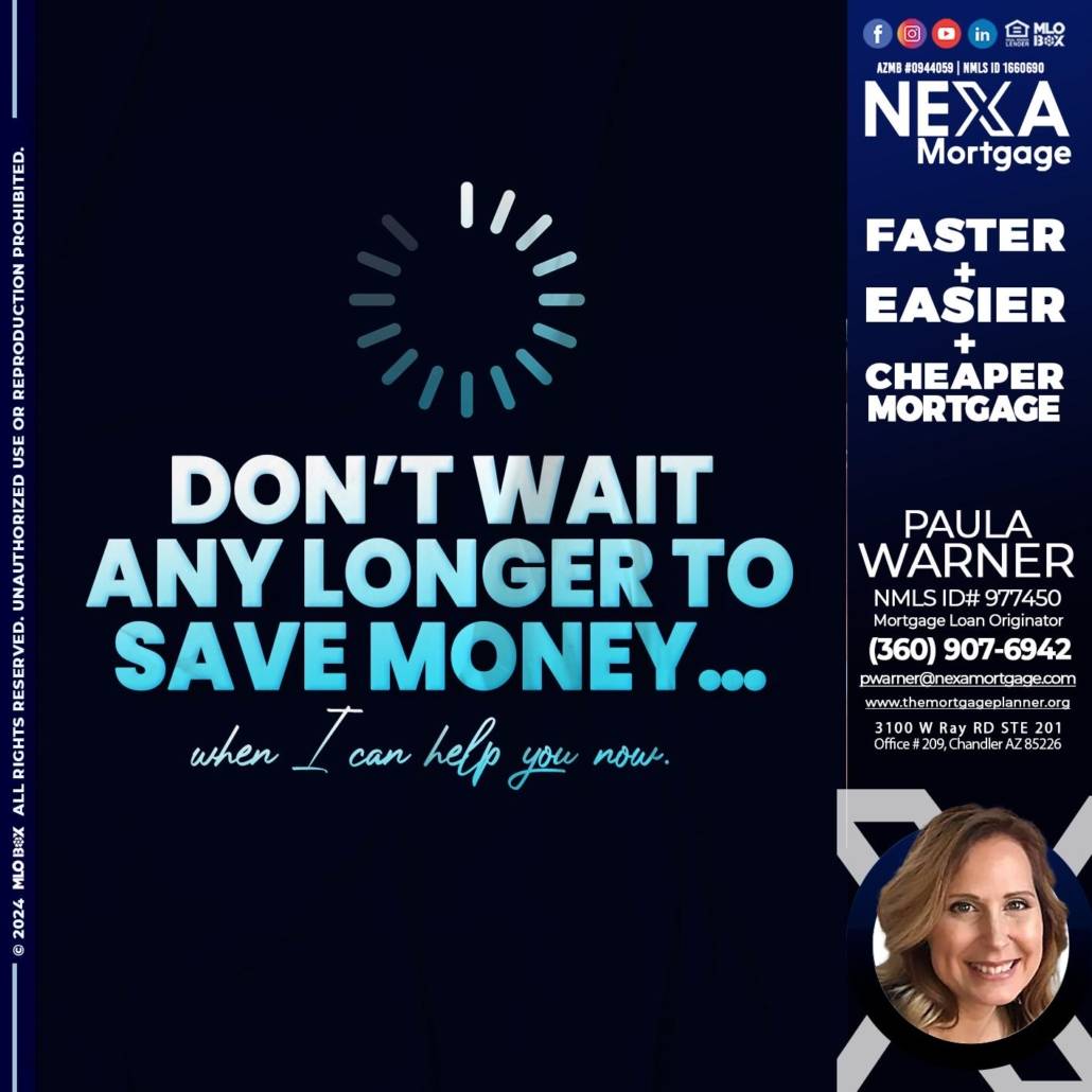 Hi, my name is Paula Warner. I’m a Loan Officer with NEXA Mortgage LLC., offering personalized mortgage solutions, fast customized quotes, great rates and service with integrity.