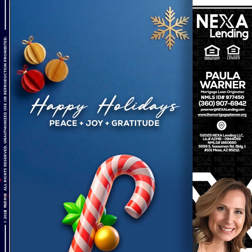 HAPPY HOLIDAYS - Paula Warner -Mortgage Loan OriginatorHi, my name is Paula Warner. I’m a Loan Officer with NEXA Lending LLC., offering personalized mortgage solutions, fast customized quotes, great rates and service with integrity.