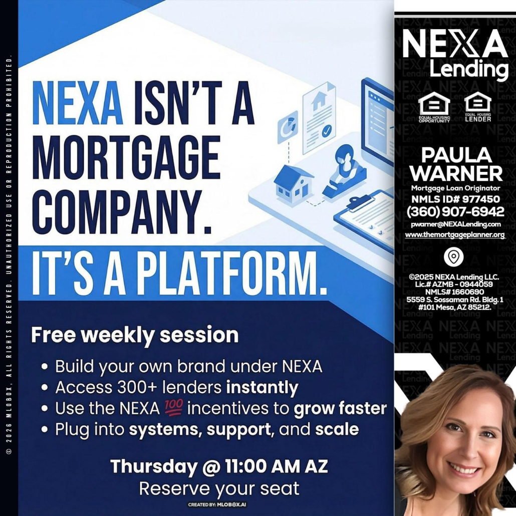 Hi, my name is Paula Warner. I’m a Loan Officer with NEXA Lending LLC., offering personalized mortgage solutions, fast customized quotes, great rates and service with integrity.