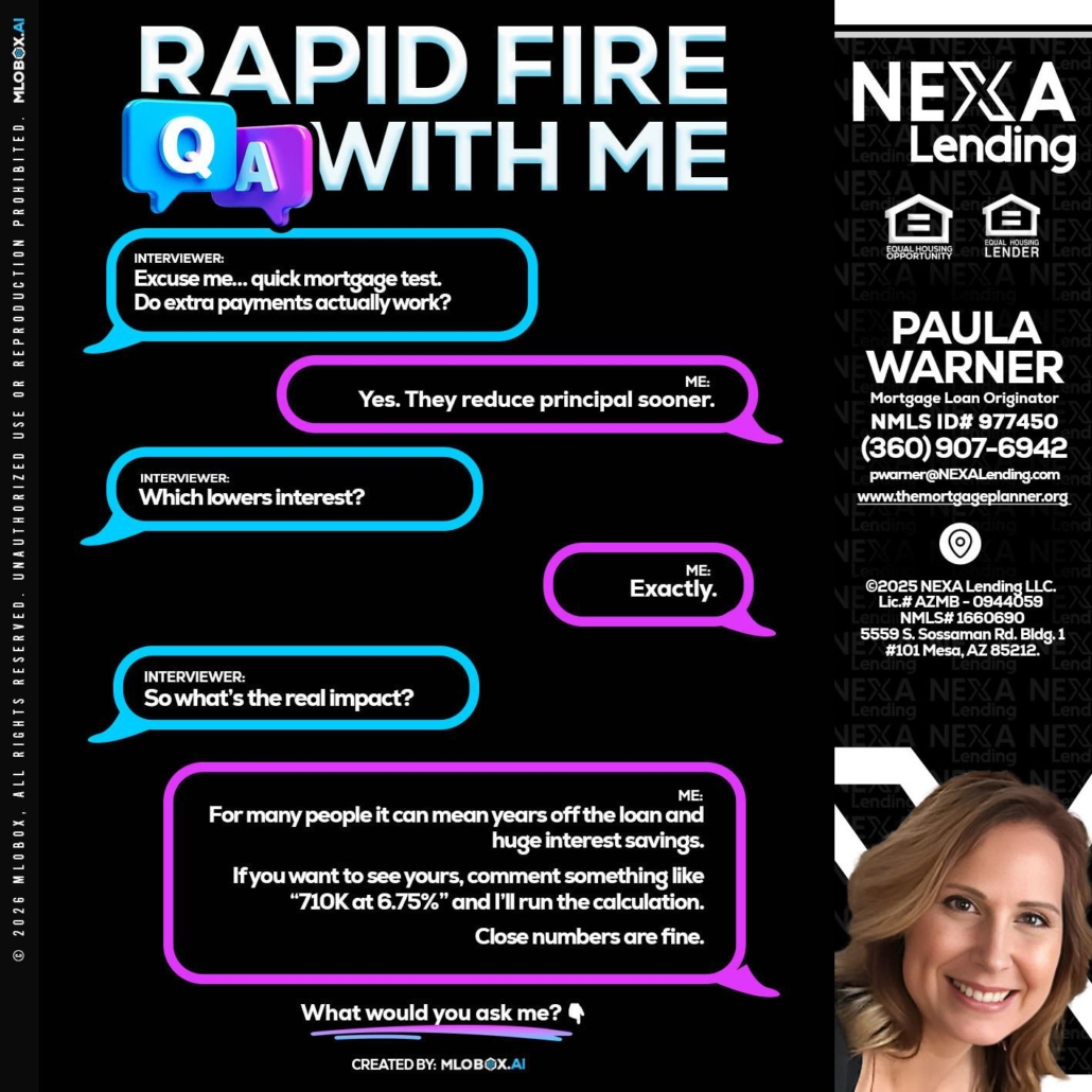 Hi, my name is Paula Warner. I’m a Loan Officer with NEXA Lending LLC., offering personalized mortgage solutions, fast customized quotes, great rates and service with integrity.