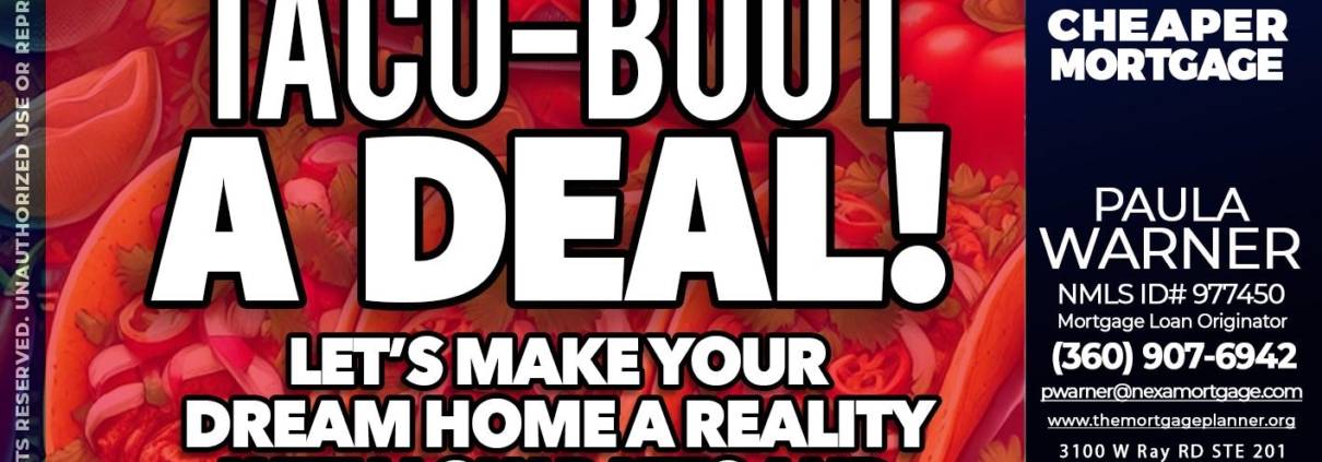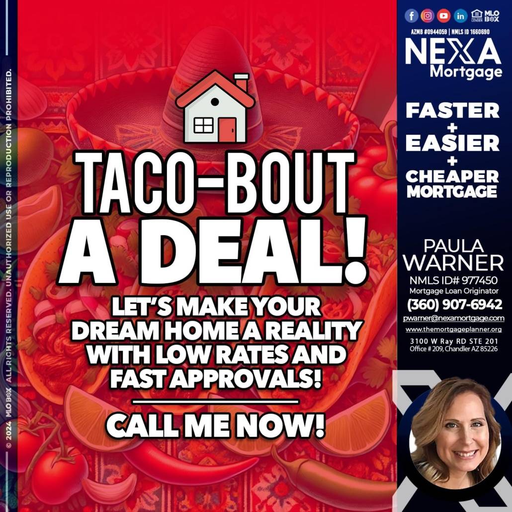 TACO-BOUT - Paula Warner -Mortgage Loan OriginatorHi, my name is Paula Warner. I’m a Loan Officer with NEXA Mortgage LLC., offering personalized mortgage solutions, fast customized quotes, great rates and service with integrity.